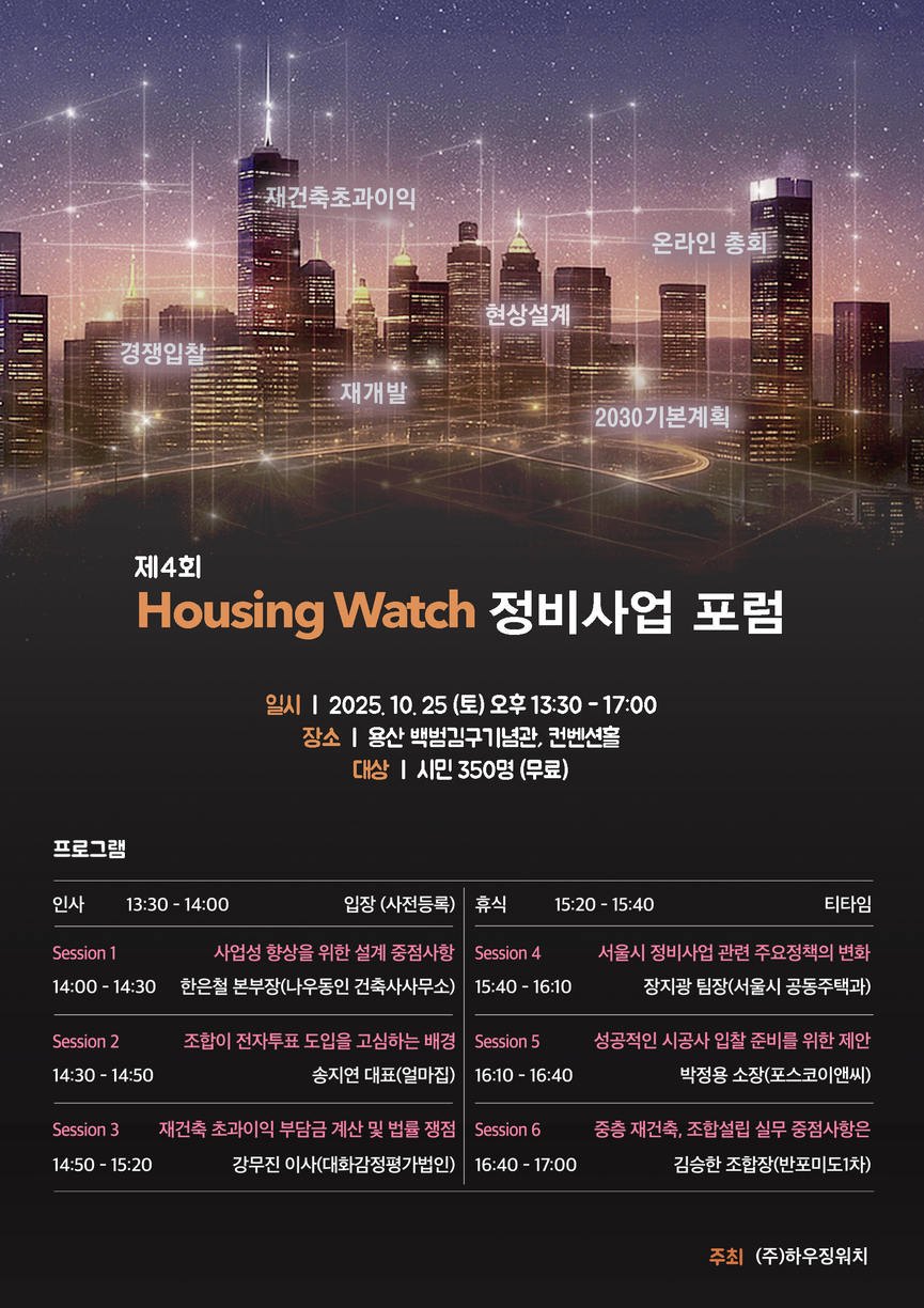 오는 10월 25일(토) [제4회 Housing Watch 정비사업 포럼]을 개최합니다.