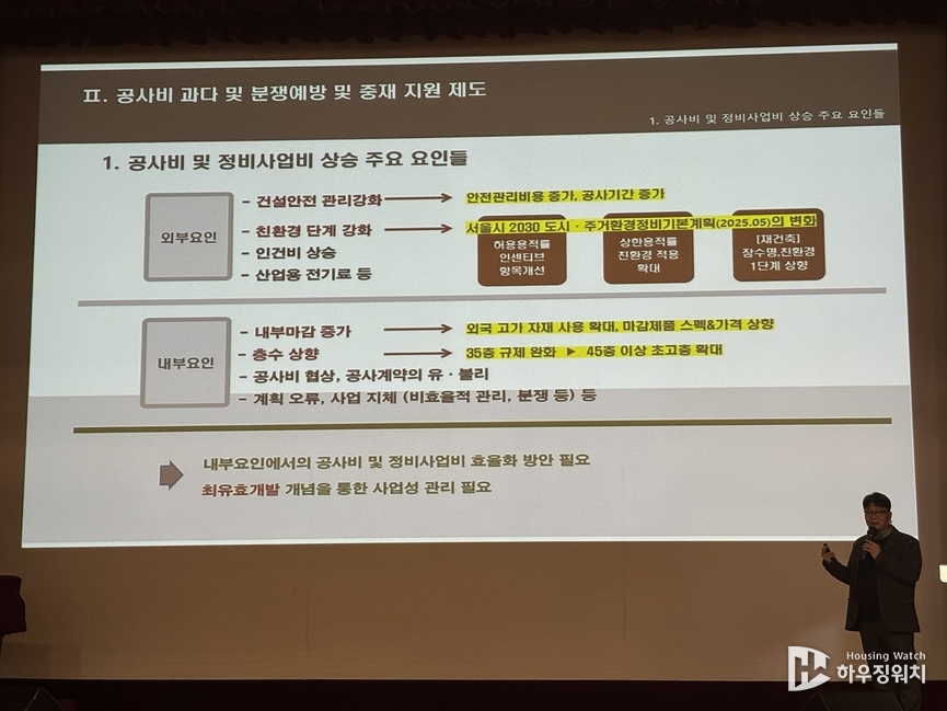 그는 "품질을 어느 수준으로 맞추고, 분양물량을 얼마나 뽑는지는 조합과 사업시행자의 몫"이라며 "적정선에서의 타협점을 찾아 최유효개발을 하는 것이 공사비를 줄이는 지름길"이라고 설명했다.