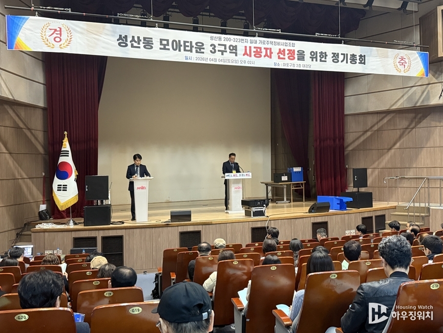 5일 정비업계 따르면 성산동 모아주택3구역(성산동200-323번지 일대) 가로주택정비사업 조합(김태수 조합장)은 최근 시공사 선정을 위한 정기총회를 열어, 대우건설을 시공 파트너로 낙점했다. 총회 의장을 맡은 김태수 조합장은 축제의 현장을 찾아주신 조합원들에게 공정성·투명성을 최우선 원칙으로, 지금의 삶의 터전을 명품 주거단지로 조성하기 위해 책임감 있게 사업을 이끌어 나가겠다고 인사말을 건넸다.