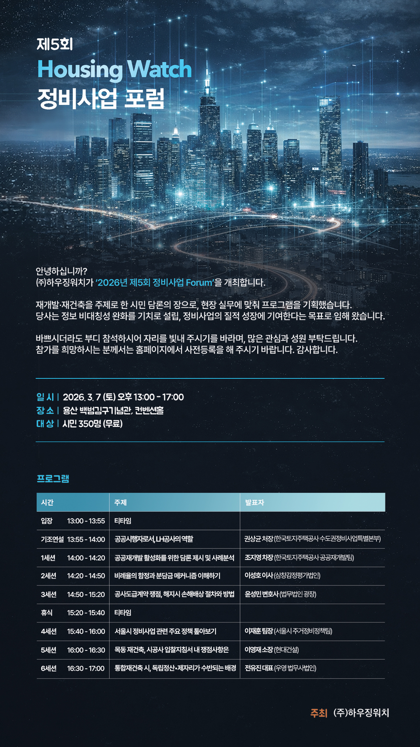 | 공지 | [포럼] 제5회 Housing Watch 정비사업 포럼 - 2026.03.07(토) | 하우징워치 | 2026/02/03 | 4341 | 2 |