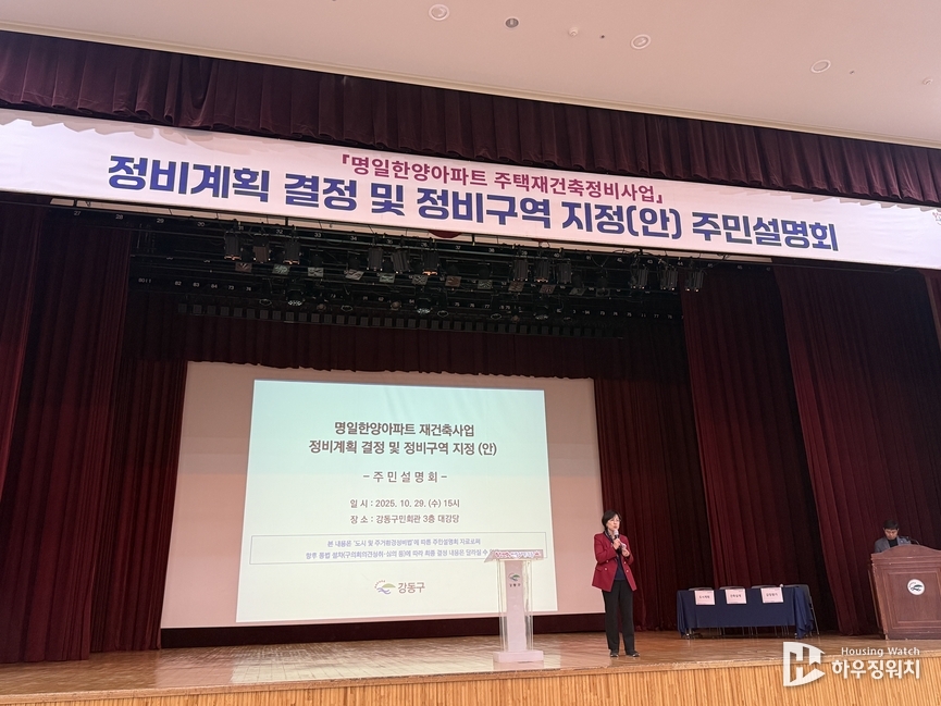 10일 정비업계 따르면 강동구청은 명일한양아파트 재건축 정비계획(안) 수립을 위한 법정 주민설명회를 개최했다. 나우동인 건축사사무소와 중앙감정평가법인이 용역업체로 참여했다. 추정비례율은 지난 9월 강동구청 검증위원회 기준으로 약 98%로 산출됐다. 조합원 분양가는 ▲59㎡(12.2억원) ▲84㎡(15.8억원) ▲93㎡(17.5억억원) ▲103㎡(18.5억원) ▲119㎡(19.9억원) 등으로 산정됐다.