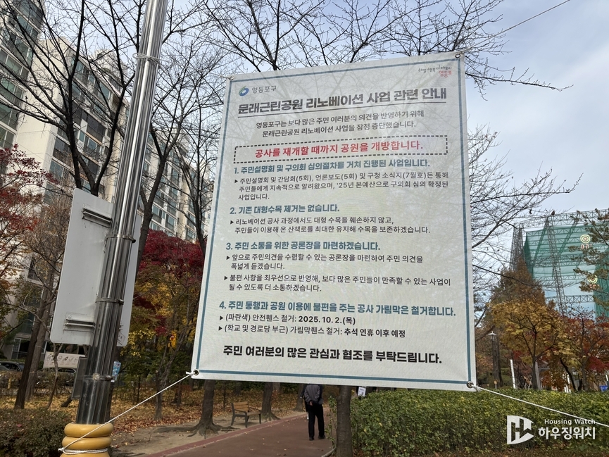 한편 현재 대상지 앞에 있는 문래근린공원은 노후화로 인한 리노베이션 사업을 위한 준비 단계에 돌입한 상태다. 당일 현장을 방문한 최호권 영등포구청장은 "폭우가 쏟아질때마다 물웅덩이가 생기고, 놀이터와 운동기구가 오래돼 주민 불만이 많아 보수 작업을 검토하게 됐다"며 "수목은 훼손없이 보존하고, 황토길 대신 게르마늄길 등을 조성해 주민 편의에 앞장서겠다"고 말했다.