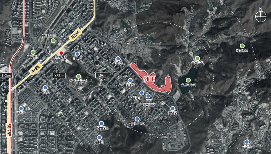 서현·공원마을의 사업 소재지는 경기도 성남시 분당구 서현동335-1번지 일대로, 구역계는 약 12만2,000㎡다. 지하3층-지상42층 규모의 공동주택 1,600여새대를 짓는 재개발 프로젝트다. 현재 제1종일반주거지역으로, 현황용적률은 140%를 사용한 상황이다. 대상지 내 노후화된 건축물의 비율은 약 92%며, 단독주택 비율이 94%로 사업성이 양호한 편에 속하는 것으로 평가된다.