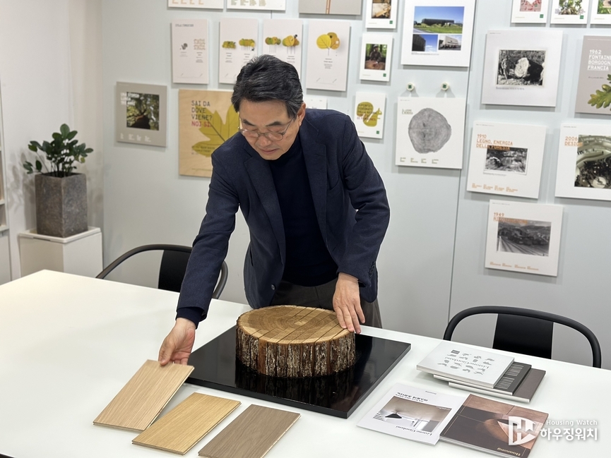 이정빈 ㈜하농 대표(사진)는 하우징워치를 만나 가장 먼저 원목마루에 사용되는 통나무 모형부터 책상 위에 불쑥 올려놓았다. 통상적인 회사 소개가 아닌, 나이테가 선명하게 보이는 통나무의 향부터 맡아볼 것을 권했다. 실제 회의실 안은 인위적인 디퓨저 향 대신 나무 냄새로 가득했다. 올해로 32년차의 업력을 가진 ㈜하농은 이탈리아 원목마루인 리스토네 조르다노(Listone Giordano)를 주력 브랜드로 둔 기업이다.