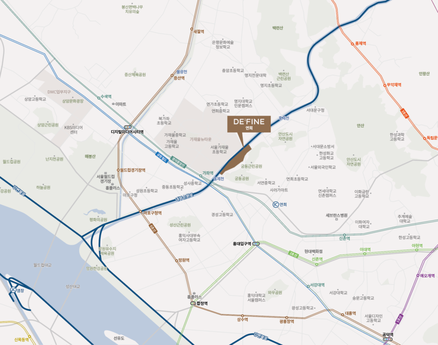 드파인 연희의 핵심 경쟁력은 단연 입지 환경이다. 단지 바로 앞에는 홍제천이 흐르고, 가좌근린공원·안산도시자연공원이 주변을 감싸는 구조다. 서울 안에서도 보기 드문 숲세권·공세권 입지를 갖춰 조용하고 여유로움 삶을 향유할 수 있을 것으로 예측된다. 대신 지하철(경의중앙선) 도보 접근성은 다소 취약해, 버스 이용 비중이 높을 것으로 전망된다.