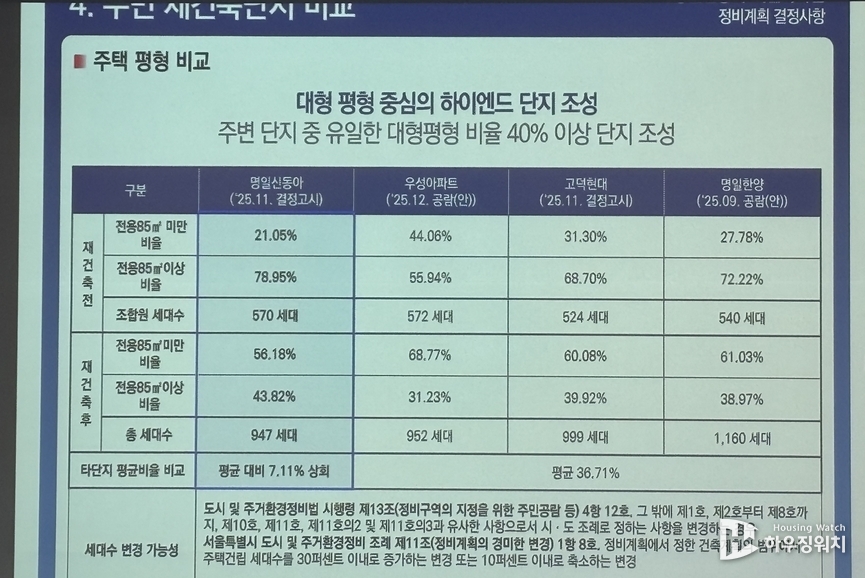 명일신동아는 인접 단지들과 달리, 대형평형 비율이 전체의 43.8% 가량을 차지한다. 객관적으로 ▲명일우성(31.2%) ▲고덕현대(33.9%) ▲명일한양(38.9%)과 비교했을 때도 많은 수치다. 다만 현재는 사업 초기 단계로 언제든 세대수 변경과 관련한 가능성이 큰 만큼, 대상지는 향후 정비계획의 경미한 변경을 통해 세대수 조정이 가능하다. 경미한 변경은 주택건립 세대수를 30% 이내로 증가하거나 10% 이내로 축소하는 경우 가능하다.