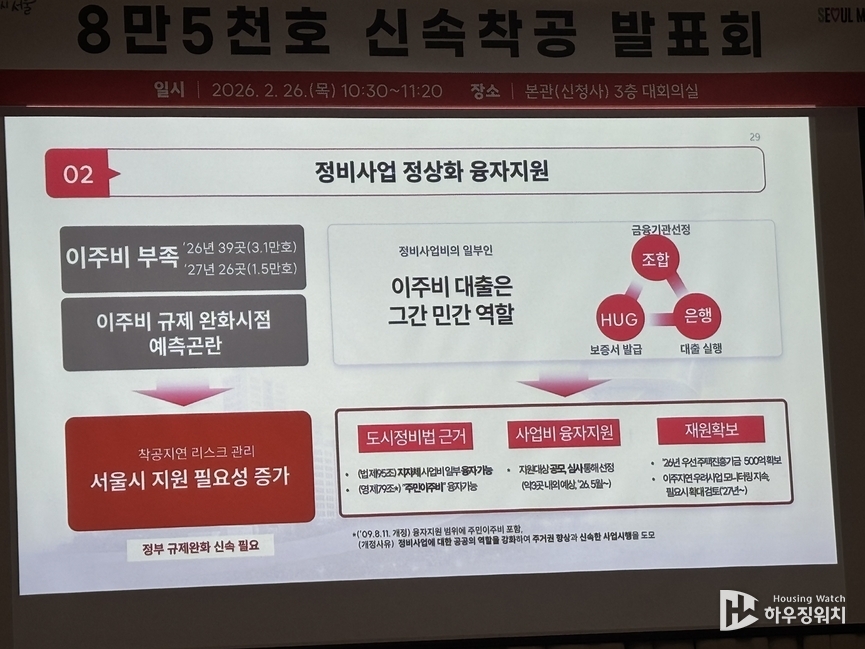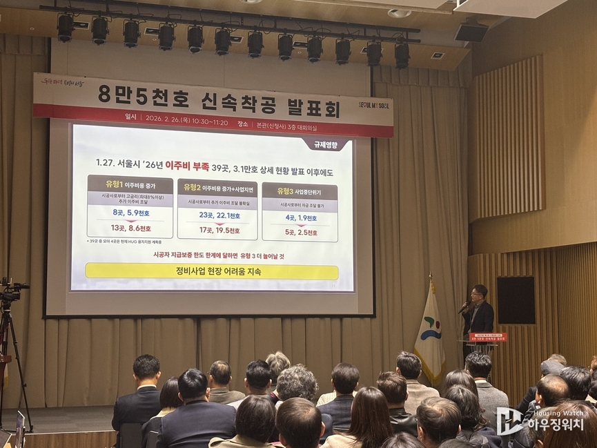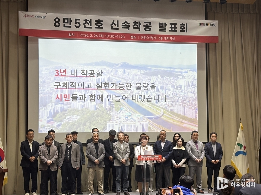 서울시는 26일 오전 서울시청 간담회장에서 '8만5,000호 신속 착공 발표회'를 개최해 정비사업 현장 최전선에서 근무하는 조합장·조합원들과 소통하는 시간을 가졌다. 이번 발표회의 취지는 위축된 정비사업에 활력을 불어 넣고, 이주비 대출로 어려움을 겪는 사업장에 실질적인 해결 방안을 제시하기 위함이다.