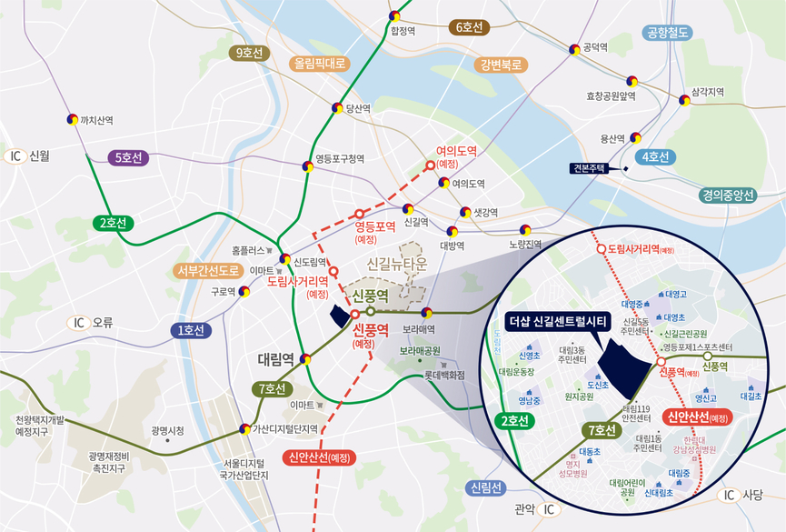 해당 단지는 서울에선 비교적 보기 드문 대규모 브랜드 단지로 조성되는 만큼, 향후 지역의 랜드마크 가능성에 대한 기대감이 크다. 단지 주변으로 지하철 7호선 신풍역이 위치해 있어 도보 이용이 가능하며, 향후 신안산선 개통시엔 교통 편의성이 더욱 개선될 것으로 보인다. 차량 이동시엔 남부 순환로, 경인로, 서부간선도로, 올림픽대로 등 주요 간선도로 접근이 수월하다.