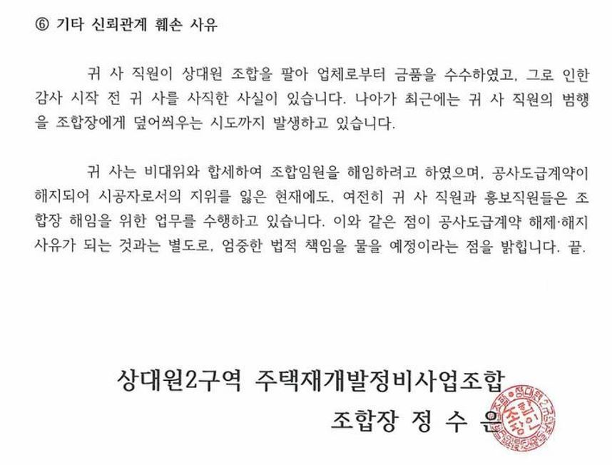 조합이 보낸 공문에 따르면, DL이앤씨 직원이 업체로부터 금품을 수수했고, 감사가 시작되기 전 회사를 사직했다고 기재돼 있다. 이를 조합장에게 덮어씌우려는 시도가 있었다는 게 조합의 주장이다. 조합장은 최근 마감재 납품 관련 금품 수수 혐의로 경찰 압수수색을 받았다. 또한, 조합과 계약이 체결돼 있었던 DL이앤씨가 비상대책위원회와 함께 조합 집행부를 해임하기 위한 업무를 수행했다는 점을 '신뢰관계' 훼손의 사유로 들었다.