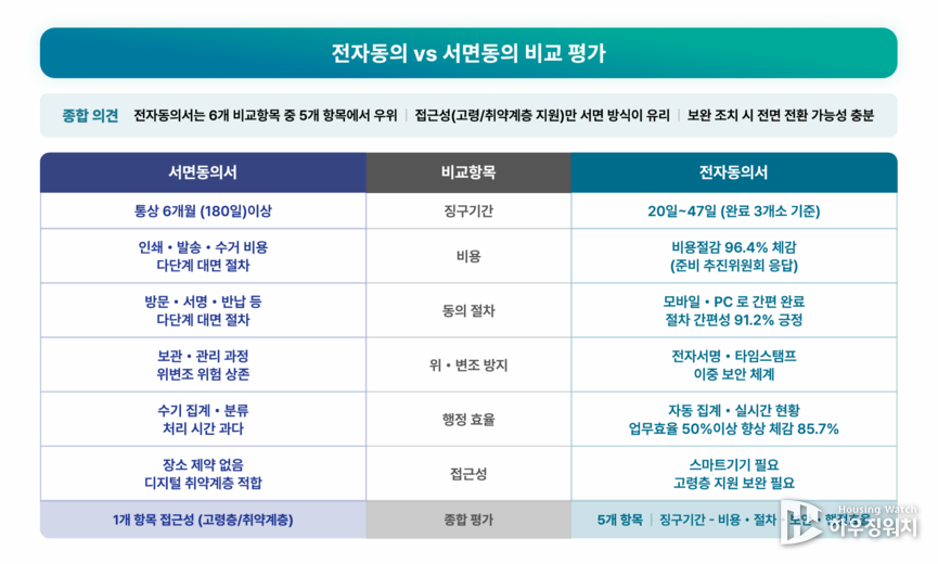 정비사업 현장에서의 전자동의 활용에 대한 필요성이 나날이 높아지고 있는 가운데, 서울시-이제이엠컴퍼니가 공동 진행한 '전자동의서 시범사업' 결과가 공개돼 눈길을 끈다. 실제 현장의 목소리가 반영된 이번 조사에서 주목할 부분은 전자동의가 서면동의에 비해 6개 중 5개 항목에서 월등한 우위를 보였다는 점이다. 고령층의 접근성 측면만 보완된다면, 더이상 서면동의만 고집할 필요가 없는 셈이다.