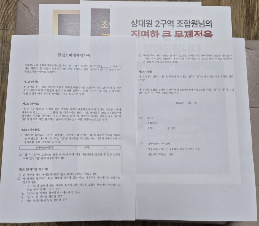24일 정비업계 따르면 상대원2구역 조합은 오는 5월 1일 GS건설을 시공사로 선정하는 총회를 앞두고 있는 반면, DL이앤씨는 해임총회 이후 시공권 재신임을 목표로 조합원들에게 금전소비대차 계약 체결을 안내하고 있다. 금전소비대차계약서에 따르면, 대여기간은 오는 2026년 8월 말까지로 이자는 연 단리 4%로 책정했다. 조합원들이 자납해야 할 이자비용은 우선 내주고, 8월 말 원리금(원금+이자)을 상환받겠다는 게 골자다. 연체이자는 대여이자에 3%p로 책정됐다.